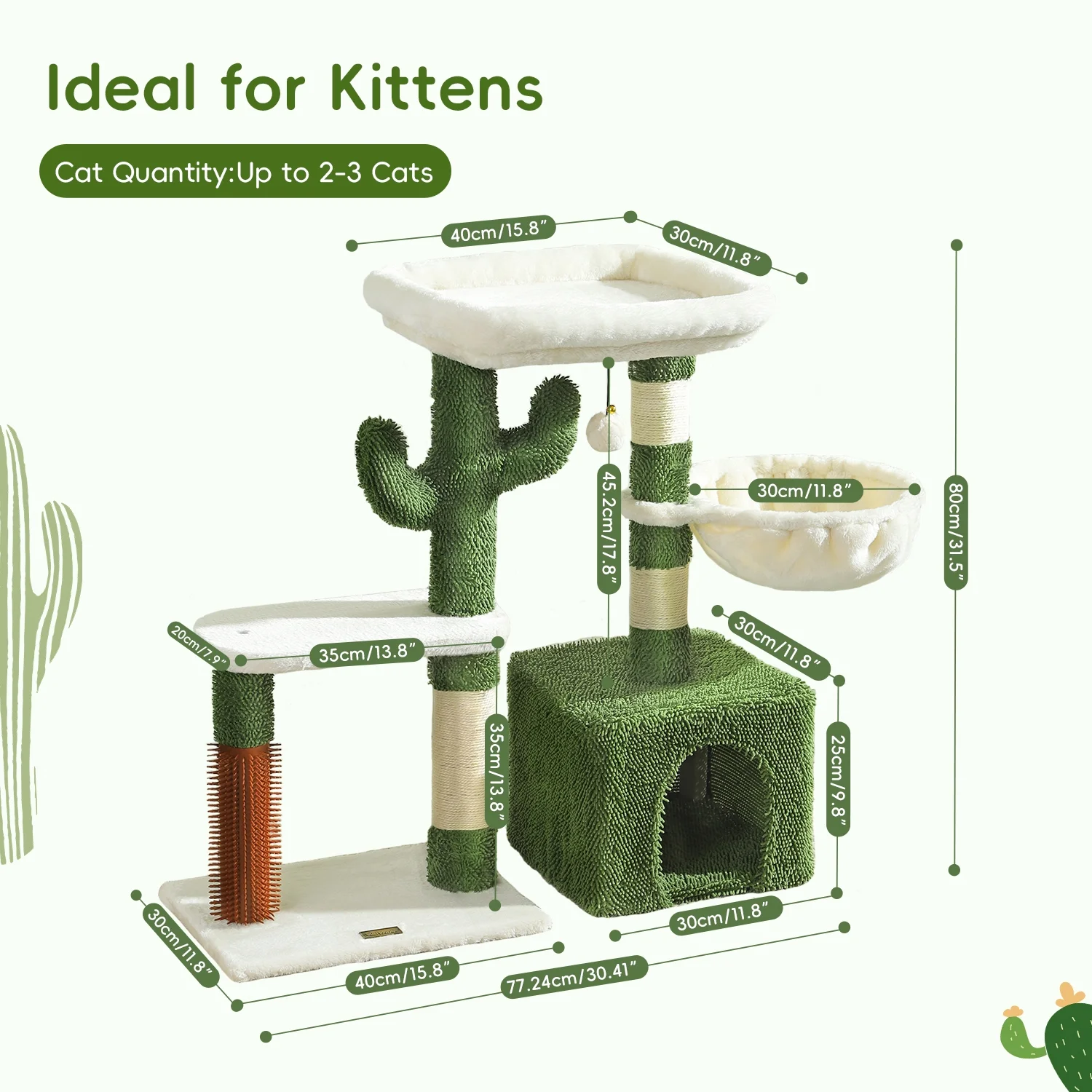 The 32-Inch Cactus Cat Tree provides a fun and modern multi-level play and rest area for your indoor feline friends. Featuring a vibrant green cactus design, this cat tower seamlessly blends into your home decor while offering comfortable resting spaces like a cozy condo and a soft perch, perfect for small cats and kittens to lounge and nap. Durable sisal scratching posts of varying heights encourage natural scratching, helping to keep claws healthy and protect your furniture, all within a compact design suitable for homes with limited space.