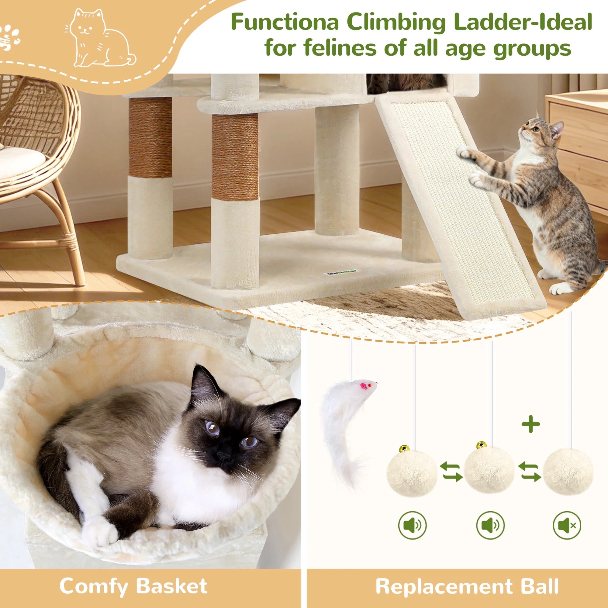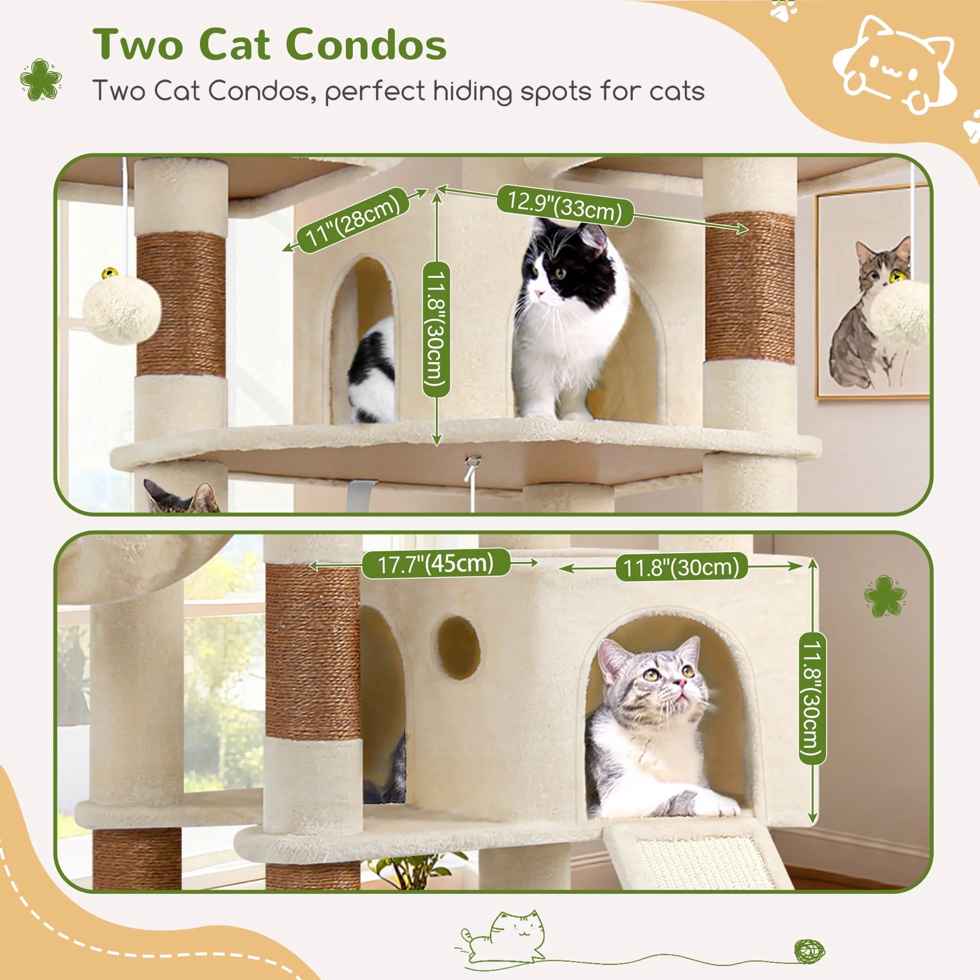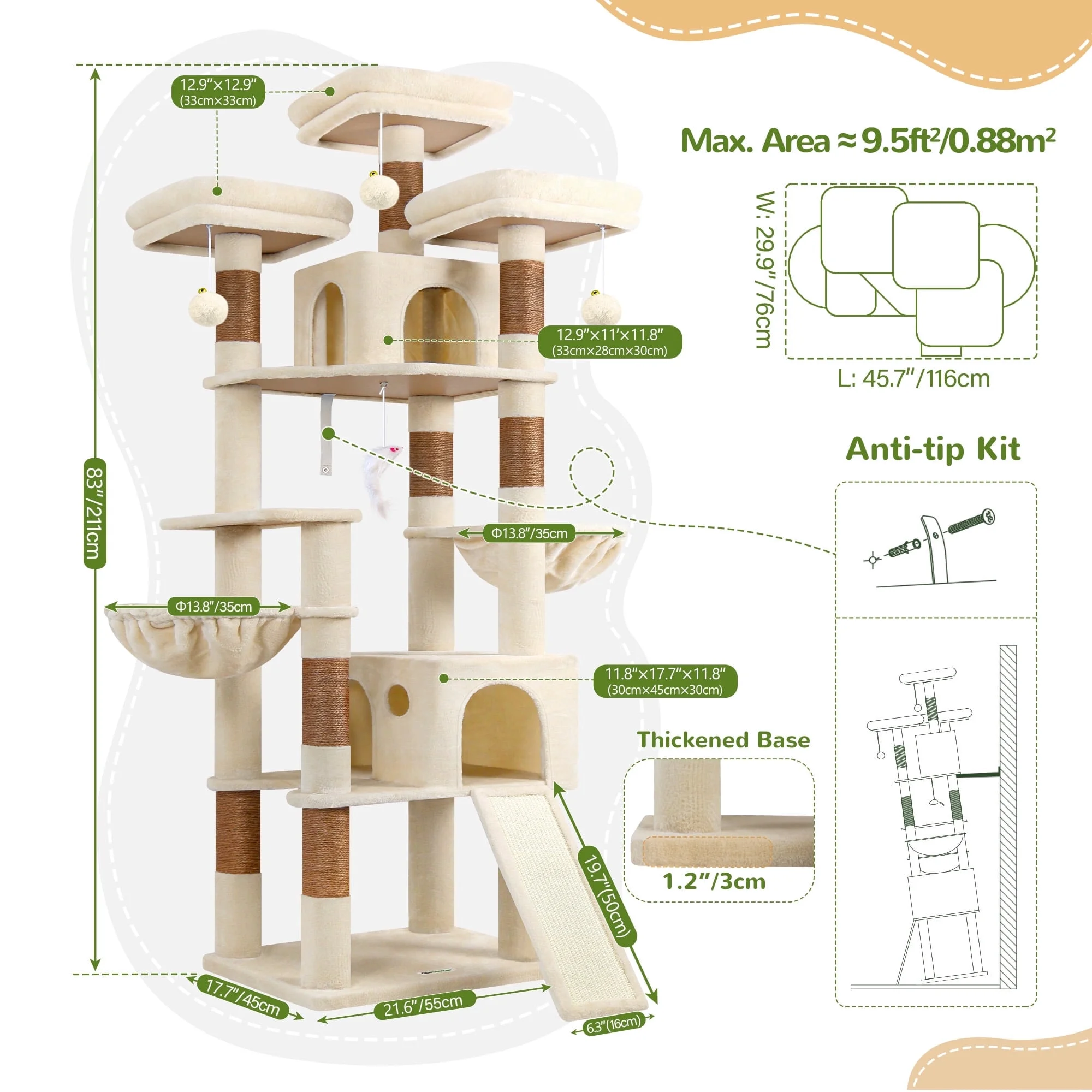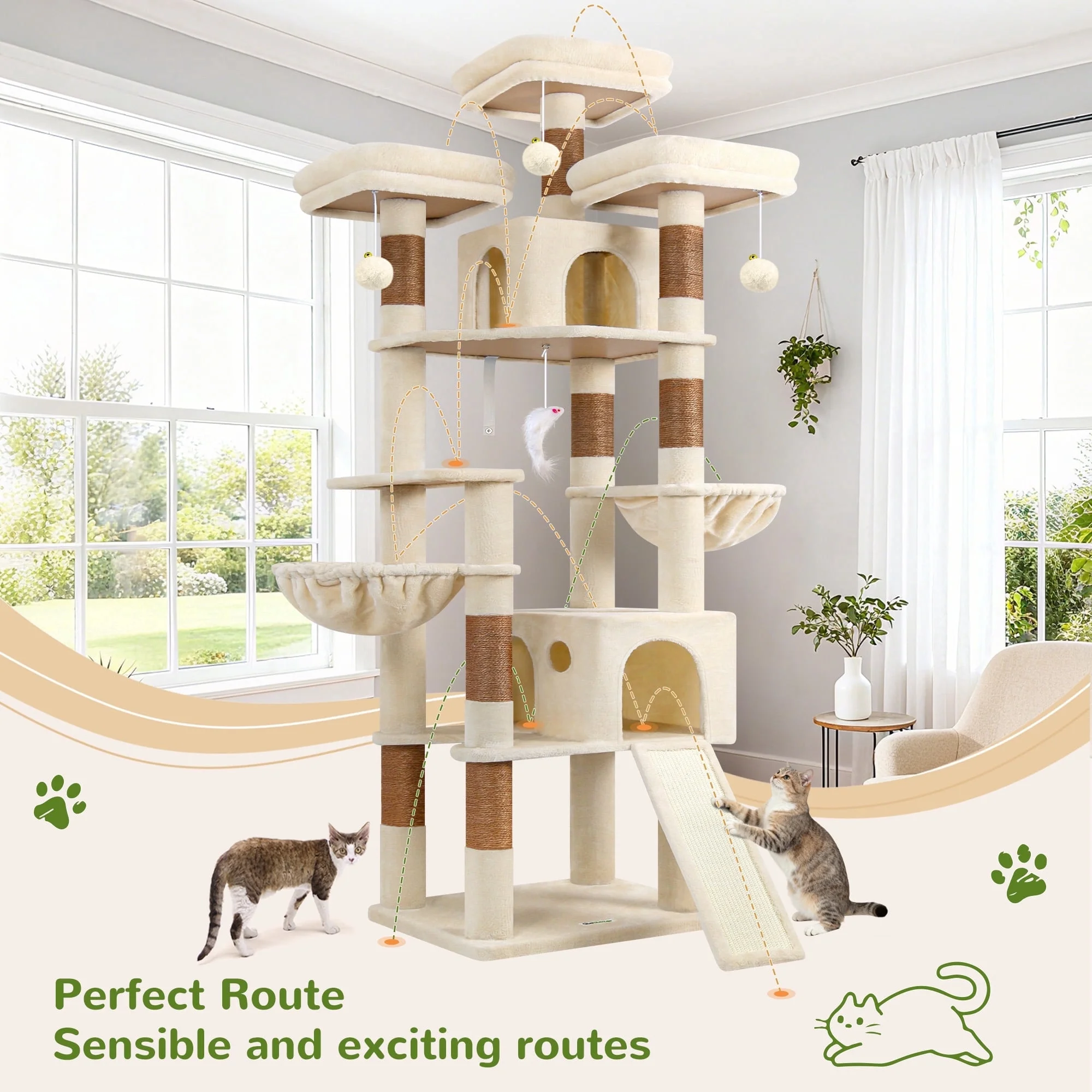 Built with 2-inch-thick sisal poles, a weighted 21.6×17.7-inch base and ceiling tensioner, this floor-to-ceiling cat tree supports multiple heavy cats (e.g., Maine Coons) without wobbling. 13.8-inch hammocks hold up to 44 lbs each; 12.9×12.9-inch plush platforms double as resting spots and climbing steps, perfect for play, nap time and stretching. 8 pieces of 2-inch-thick sisal poles let big cats stretch to their full length, satisfying scratching instincts while promoting ergonomic joint health. Removable top platform enables easy cleaning and maintenance.All platforms and lying areas are fully upholstered in deliciously plush, which turns each platform into an amazing place for your…